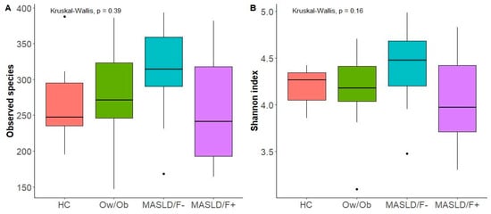 Boxplots of alpha-diversity indices. Alpha-diversity comparisons of the gut microbiota of the healthy controls (HCs), overweight/obese without MASLD (Ow/Ob), MASLD without fibrosis (MASLD/F−), and MASLD with fibrosis (MASLD/F+). (A) Observed species. (B) Shannon index. p < 0.05 (Kruskal–Wallis).