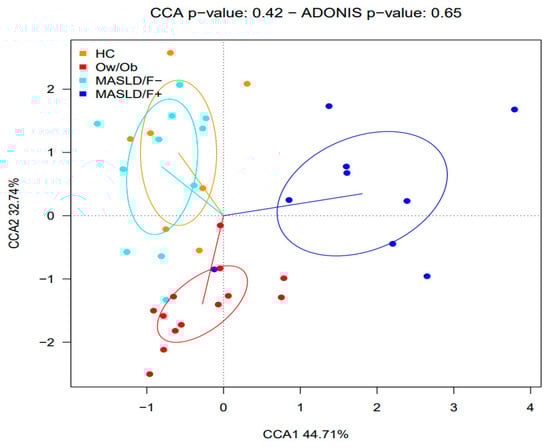 Canonical correspondence analysis (CCA) shows the correlation between the gut microbiota compositions at the species level of healthy control (HC), overweight/obese without MASLD (Ow/Ob), MASLD without fibrosis (MASLD/F−), and MASLD with fibrosis (MASLD/F+).