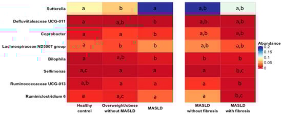 Heatmap showing the abundance difference of the gut microbiota at the genus level among healthy controls (HCs), overweight/obese without MASLD (Ow/Ob), MASLD patients, MASLD without fibrosis (MASLD/F−), and MASLD with fibrosis (MASLD/F+). For each heatmap row, values with different superscripts are significantly different (p < 0.05 (Kruskal–Wallis test among groups and post hoc Dunn’s test)). The scale was normalized for better visualization of the data.