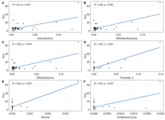 In addition, liver stiffness values positively correlated with the abundance of Actinobacteria phylum (R = 0.6, p = 0.0053) (Figure 4A), Bifidobacteriaceae family (R = 0.68, p = 0.00067) (Figure 4B), and Bifidobacterium (R = 0.68, p = 0.00072) (Figure 4C), Prevotella 2 (R = 0.85, p = 2.28 × 10−9) (Figure 4D), Sarcina (R = 0.85, p = 2.28 × 10−9) (Figure 4E), and Acidaminococcus genera (R = 0.63, p = 0.0063) (Figure 4F).