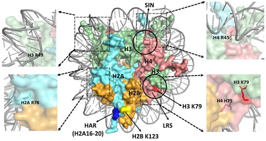 Structure of a yeast nucleosome, highlighting key regions in the nucleosome surface. The loss of ribosomal silencing (LRS) and Sin− (SIN) domains are indicated with circles. The histone residues H3 K79, H2B K123, and the histone H2A repression (HAR) domain (i.e., H2A residues 16–20) are indicated in red, yellow, and blue color, respectively. The positions of the sprocket arginine residues H2A R78, H3 R49, and H4 R45 are indicated in zoomed images. The location of H3K79 residue (red) in the central region of LRS domain and the neighboring H4 H75 residue (salmon red) is also depicted in a zoomed image. The figure was generated using pymol from PDB ID:1ID3.