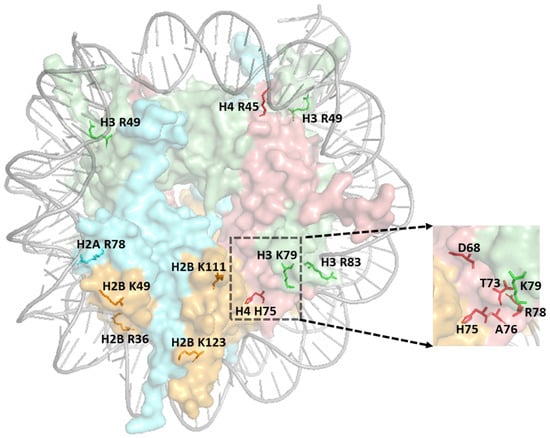 While the discussion above focuses on sprocket arginine residues, many other histone residues also affect nucleosome stability, dynamics, and binding interfaces and potentially play a role in DNA damage sensitivity and repair. For example, a recent study used saturation mutagenesis targeted to a small region of histone H4 associated with the LRS domain to identify histone mutants that affected UV sensitivity in yeast. This study identified 24 mutations that either enhanced or reduced UV sensitivity, one of which (histone H4 H75E) significantly decreased GG-NER activity []. Although the H4 H75E mutant did not affect the methylation of neighboring H3 K79 (Figure 3), it impaired chromatin binding of the key DNA damage sensor Rad4. Other H4 mutants identified in the screen (e.g., H4 T73D, T73F, T73Y, R78I, D68I, A76T, R78S, and T80L, see Figure 4) affected PRR by TLS DNA polymerases, resulting in reduced UV-induced mutagenesis []. This study not only identified new histone mutants that affect repair and the DNA damage response, but also suggests that current histone mutant libraries, which primarily consist of substitutions to alanine, may be missing non-alanine substitutions that have important biological phenotypes. Consistent with this idea, most of the candidate oncohistone mutations identified in human cancers are not alanine substitutions [,]