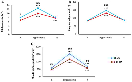 Tidal volume (A), frequency of breathing (B) and minute ventilation (C) during air breathing (normocapnia) and ventilatory response to hypercapnia in Sham (blue line) and 6-OHDA-treated rats (red line). Differences between Sham and 6-OHDA groups were assessed using the Mann-Whitney U test. The Wilcoxon signed-rank test was used to compare the response to hypercapnia and recovery time (R) with control values during normocapnia (C). The data are presented as mean ± SEM; *** p < 0.001 vs. normocapnia control value, # p < 0.05, ## p < 0.01, ### p < 0.001 vs. 6-OHDA-treated group (n = 20 per group).
