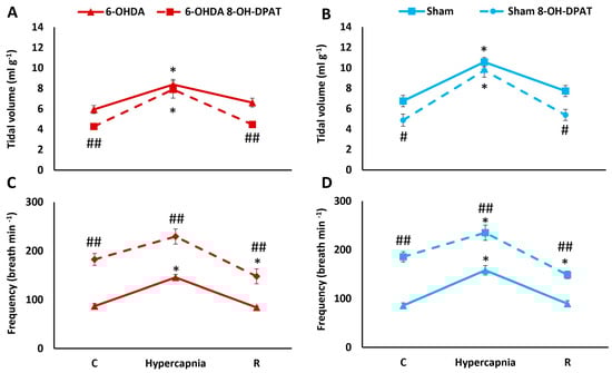 Tidal volume after 8-OH-DPAT injection was reduced under normocapnia, while the response to 7% hypercapnia was similar before and after the agonist in both study groups (Figure 2A,B). Administration of 8-OH-DPAT resulted in a more than two-fold increase in RR during ambient air-breathing and respiratory response to hypercapnia in 6-OHDA lesioned and Sham rats (Figure 2C,D).