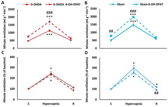 Minute ventilation (A,B) during air breathing (normocapnia) and ventilatory response to hypercapnia in Sham ((B), blue line) and 6-OHDA-treated rats ((A), red line) treated with i.p. injection of 8-OH-DPAT (dashed lines). Minute ventilation (C,D) reactivity to hypercapnia expressed as a percentage of baseline (normocapnia) in Sham ((D), blue line) and 6-OHDA-treated rats ((C), red line) treated with i.p. injection of 8-OH-DPAT (dashed lines). Two-way ANOVA followed by the Newman-Keuls post hoc test was used to analyze the data presented in panels (A,B). Data presented in panels (C,D) were evaluated using the Mann-Whitney U test (differences between Sham and 6-OHDA groups) and the Wilcoxon signed-rank test to compare hypercapnia response and recovery time (R) with control values during normocapnia (C). The data are presented as mean ± SEM; * p < 0.05, *** p < 0.001 vs. normocapnia control value, ## p < 0.01, ### p < 0.001, vs. 8-OH-DPAT untreated state (n = 6 per group).