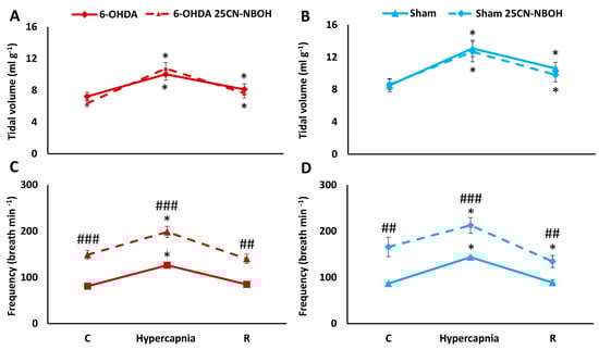 Exposure to hypercapnia significantly increased the tidal volume and respiratory rate compared to control values in both neurological conditions: 6-OHDA lesioned and Sham (Figure 4). Of the two respiratory pattern parameters, injection of 25CN-NBOH stimulated only the basal normocapnic frequency of breathing, followed by its elevated response to hypercapnia, with no effect on baseline and HCVR tidal volume values (Figure 4A,B).