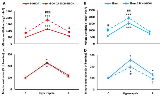 Two-way ANOVA showed the effect of hypercapnia on minute ventilation increases in both 6-OHDA (F(1,2) = 197.94, p < 0.00001) and Sham rats (F(1,2) = 146.16, p < 0.00001). Injection of 25CN-NBOH affected ventilation by increasing baseline minute ventilation and hypercapnia ventilatory response in PD rats (two-way ANOVA, F(1,2) = 20.24, p < 0.0001) and Sham rats as well (two-way ANOVA, F(1,2) = 9.25, p < 0.05) (Figure 5A,B). Additionally, there was a significant interaction effect between hypercapnia exposure and 25CN-NBOH treatment only in the PD group (two-way ANOVA, F(1,2) = 12.33, p < 0.001). MV data expressed as a percentage of change during hypercapnia exposure relative to normocapnic values showed significantly reduced responsiveness to elevated CO2 after treatment with 25CN-NBOH only in Sham rats (Figure 5C,D).