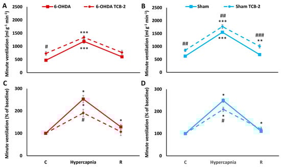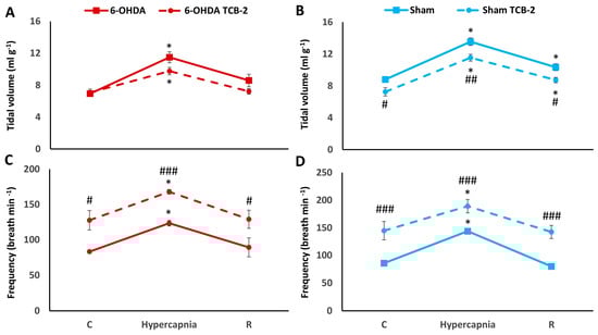 After TCB-2, normocapnic tidal volume was significantly reduced only in Sham rats by 18%. While the hypercapnic VT response after TCB-2 was reduced similarly in both groups of rats by 17%, there was a statistically significant difference only in the Sham group (Figure 6A,B). TCB-2 acts mainly by increasing baseline RR with the effect of elevated hypercapnic response of this parameter in 6-OHDA and Sham rats (Figure 6C,D).
