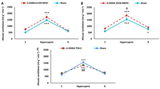 Minute ventilation during air breathing (normocapnia) and ventilatory response to hypercapnia in 6-OHDA treated rats treated with i.p. injection of 8-OH-DPAT (A), 25CN-NBOH (B), TCB-2 (C) (red line, dashed) and Sham untreated rats (blue line). Two-way ANOVA followed by the Newman-Keuls post hoc test was used to analyze the data. C stands for control value; R indicates return after hypercapnia. The data are presented as mean ± SEM; * p < 0.05, *** p < 0.001, vs. normocapnia control value, # p < 0.05, ## p < 0.01, vs. Sham untreated rats (n = 7 per group).