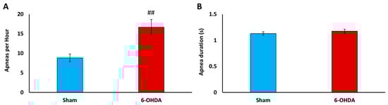 Apnea incidence (A) and duration (B) in Sham and 6-OHDA-treated rats. Student’s t-test was used to analyze differences between 6-OHDA and Sham groups, ## p < 0.01, vs. Sham rats (n = 8–10 per group).