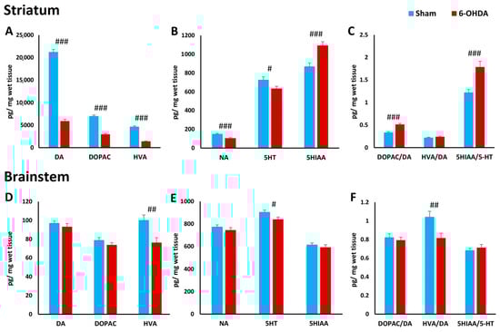 Concentration of biogenic amines in the striatum (A–C) and brainstem (D–F) of Sham and 6-OHDA-treated rats. The content of dopamine (DA), noradrenaline (NA), serotonin (5-HT), 3,4-dihydroxyphenylacetic acid (DOPAC), homovanillic acid (HVA) and 5-hydroxyindoleacetic acid (5-HIAA) was assessed by HPLC detection ex vivo and expressed as pg mg−1 of fresh tissue. Student’s t-test was used to analyze differences between the 6-OHDA and Sham groups. The data are expressed as mean ± SEM. # p < 0.05, ## p < 0.01, ### p < 0.001—significance between both groups (n = 16–18 per group).