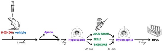 Each 6-OHDA or Sham control group was split into three subgroups, and each subgroup received only one test drug. Thirty minutes after drug injection, the animals were again exposed to the hypercapnic mixture. Two days after the breathing experiments, the rats were anesthetized and the brains (striatum, brainstem) were collected for HPLC analysis (Figure 11).