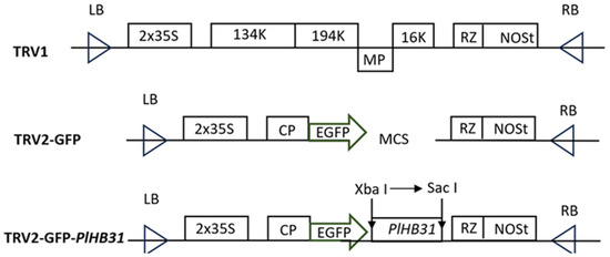 2.1. Construction of the TRV2-GFP-PlHB31 Recombinant Vector