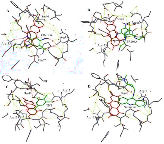 | CB-1954 | 2-NO2…Arg133, 4-NO2…Arg15, -CONH2…Arg133, Gln67 | 3.7 | 2-NO2: 2.9 (O), 3.9 (N) |