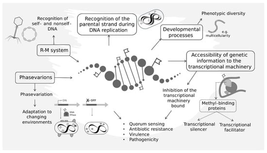 Effects of DNA methylation on cellular functions, adaptation, and evolution. DNA methylation plays a pivotal role in the replication of DNA, marking the parental strand to prevent and allow for the correction of replication errors. DNA methylation plays different roles in the adaptation of prokaryotes to the environment (e.g., quorum sensing, antibiotic resistance, virulence and pathogenicity, and developmental processes), modeling the accessibility of genetic material to the transcriptional machinery and thus influencing the transcription of genes. R-M systems, as well as the presence of phasevarions, shape the methylation pattern of prokaryotic cells through the expression of DNA MTases, with effects on environmental adaptation and the exchange of genetic material.