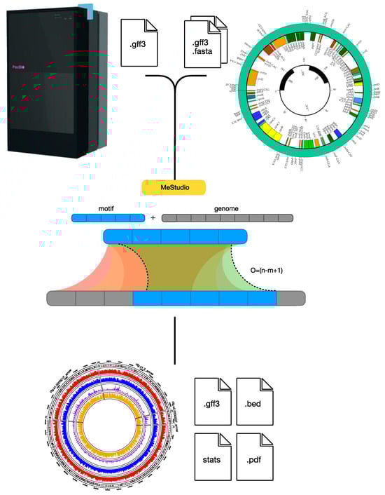 As outlined in the previous paragraphs, the interest in analyses of genome-wide methylation profiles is gaining momentum, as evidence for multiple roles of methylated DNA bases is accumulating. Moreover, single-molecule sequencing technologies, such as Pacific Biosciences single-molecule real-time (SMRT) sequencing [] and Nanopore ONT sequencing [], allow us to easily identify methylated bases at a low cost. As the price decreases and accessibility to such sequencing apparatuses increases, the number of available data are becoming important. However, now, we need easy-to-use and powerful computational tools. While several instruments have already been developed for the analysis of DNA methylation profiles deriving from bisulfite sequencing and microarrays [], there are only a few packages for Nanopore ONT and SMRT methylation data [,]. Tools have also been developed to analyze DNA methylation profiles on metagenomic data (https://github.com/hoonjeseong/Meta-epigenomics (accessed on 15 March 2024), but all of these computational packages do not offer the possibility of mapping methylated motifs with respect to annotated functional features of the genomes (e.g., coding sequences, promoters, or other relevant features or genomic positions). Our laboratory recently developed a pipeline (MeStudio []) for extracting DNA methylation information from SMRT sequencing data, allowing for the comparison of the position of methylated motifs with respect to the genome annotation. Report outputs can be used to compare the methylation status of DNA regions in different environmental contexts or to perform genome-wide comparisons of strains. MeStudio consists of a pipeline and uses a string-matching algorithm to map motif sequences to the reference genome (Figure 2). The required input data consist of the FASTA file containing the genome sequence, the genomic annotation file, and the GFF3 file containing the methylated nucleotide positions from SMRT Link software (https://www.pacb.com/smrt-link/) of Pacific Biosciences DNA sequencers. Outputs are datasets of methylated motifs with respect to genome positions, including the presence of coding sequences or other relevant annotation features listed in the GFF3 file. Such outputs can be used to statistically infer the uneven distribution of methylation and possibly produce different types of graphical representations. However, even this tool needs improvement, since we can measure the methylated bases not included in motifs only indirectly and the input from Nanopore ONT sequencing cannot be processed at the moment.