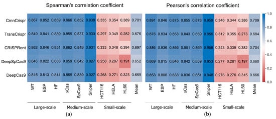 The heatmap shows (a) mean SCC and (b) mean PCC values of CrnnCrispr and four compared methods on nine datasets with three scales, including large-scale, medium-scale and small-scale datasets. The prediction methods are placed vertically, whereas the test datasets are arranged horizontally. Test datasets are classified by sample size.