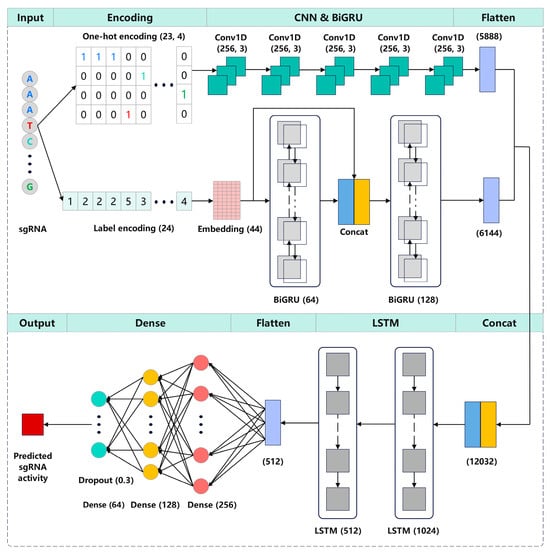 Deep learning can automatically learn the multi-layered abstract representations of input features. It performs well in handling complex features and non-linear relationships. Convolutional neural networks (CNNs) [5] and recurrent neural networks (RNNs) are two commonly used architectures of deep learning [6]. CNNs perform well in the field of computer vision and have also gained widespread attention in sequence processing problems [7,8], which can identify longer-term patterns in sequences with less computational cost. For example, Xue et al. [9] proposed a CNN-based DeepCas9 method for on-target activity prediction, which skips the step of feature extraction from sequence objects by automatically learning sequence determinants and further identifying functional sgRNAs. On the other hand, RNNs, such as long short-term memory (LSTM) [10] and gated recurrent unit (GRU) [11], can update their internal states as they read input sequences, allowing them to capture interactions between units in the sequence. RNNs can extract high-dimensional feature representations in sgRNA sequences that are different from those of CNNs. For instance, Wang et al. [12] developed an RNN-based method called DeepHF for on-target activity prediction. It used LSTM to generate new patterns based on previously learned patterns and features of sgRNA. This characteristic allows it to capture the sequence information from sgRNA. Zhang et al. [13] proposed a hybrid architecture, C-RNNCrispr, which combines a CNN and an RNN for predicting sgRNA activity. It utilized the CNN to extract sequence features and applied bidirectional GRU (BiGRU) [14] to model the positional dependencies of sgRNA sequences in both forward and reverse orders. By integrating the multi-level representation of the CNN with a contextual understanding of BiGRU, C-RNNCrispr achieved good feature extraction capability, thus improving the model’s performance.