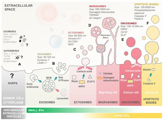 Extracellular vesicles (EVs) are particles released from cells, delimited by a lipid bilayer, that cannot replicate on their own []. Importantly, EVs have been proposed to be fundamental in cell–cell communication in both healthy and pathological conditions [,,]. There exist multiple types of EVs, which differ in their biogenesis, size, function, and the markers they express [] (Figure 1).