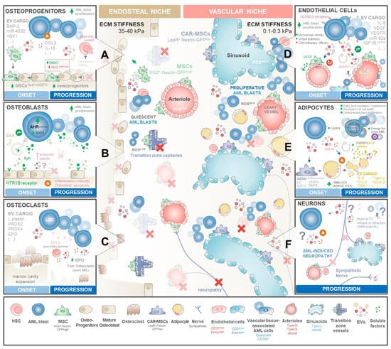 Many of the cytokines (including TNF-α, IL1-β, IFN-γ) and EVs, shed by LSCs for self-sustained growth concomitantly induces a pro-inflammatory and anti-angiogenic milieu in endosteal regions. This is an important landmark for re-educating endosteal niche mesenchymal stromal/stem cells, osteoprogenitors, endothelial cells, and, as recently shown, even healthy HSPCs [] into a pro-leukaemic phenotype. This crosstalk triggers an extensive remodelling of the endosteum, yielding impaired osteoblastic differentiation with deficient bone mineralization while compromising the niche’s vasculature, suppressing its ability to maintain and properly regulate haematopoiesis. Next, we will address how the secretome and EVs shed by LSCs re-educate these surrounding cells and how leukaemia capitalizes on this crosstalk for disease progression.