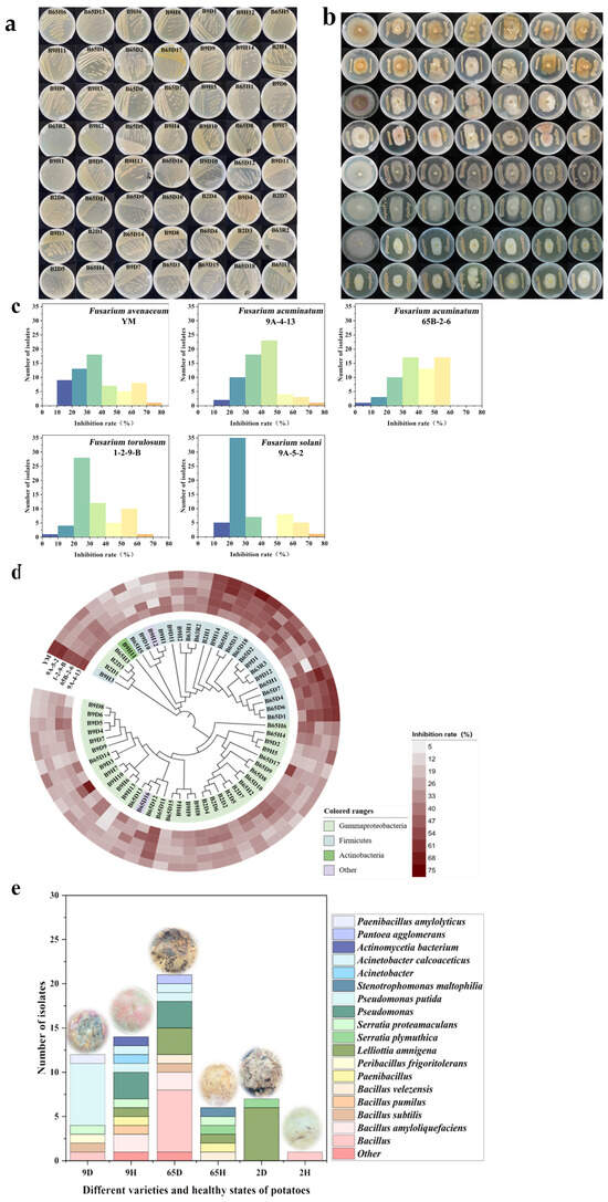 Cultivation of biocontrol strains for dry rot disease. (a,b) Morphology of isolated strains and their inhibition of Fusarium spp. (c) The range of inhibitory rates of isolated strains on Fusarium spp. (d) Phylogenetic tree of isolated strains and heat map of their inhibition rates against Fusarium spp. (e) Composition of strains isolated from potato samples of different varieties and healthy states (9D: Qingshu No. 9 diseased tuber, 9H: Qingshu No. 9 healthy tuber; 65D: Xiazhai No. 65 diseased tuber, 65H: Xiazhai No. 65 healthy tuber, 2D: Qingshu No. 2 diseased tuber, 2H: Qingshu No. 2 healthy tuber).