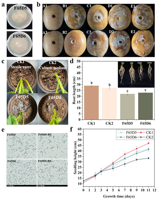 Cultivation of pathogenic strains for dry rot disease. (a) Morphology of isolated strains. (b) Pathogenicity assay of F65D5 and F65D6 strains (A1, A2: control, B1, B2: symptoms after inoculation of F65D5 and F65D6 plugs, C1, C2: symptoms after inoculation of F65D5 and F65D6 fermentation broth, D1, D2: symptoms after inoculation of F65D5 and F65D6 cell suspension, E1 and E2: symptoms after inoculation of F65D5 and F65D6 strains isolated again according to Koch’s rules). (c) The effect of inoculation with F65D5 and F65D6 strains on potted soil. (d) The effects of F65D5 and F65D6 on the root length of potato seedlings.The lowercase letters in (d) are significant difference markers (significance level is 0.05). (e) The spore morphology of F65D5 and F65D6 isolated for the first and second time follows Koch’s rule (the scale bar is 10 μm). (f) The effect of F65D5 and F65D6 on the height of potato seedlings.