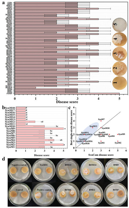 Preliminary screening of synthetic microbial communities. (a) Disease scores of all member strains of the synthetic microbial community. Disease score 1: No obvious symptoms of mycelium infection, Disease score 2: The area of mycelium infection is less than 15%, Disease score 3: The area of mycelium infection is less than 30%, Disease score 4: The area of mycelium infection is less than 45%, Disease score 5: The area of mycelium infection is more than 60%. (b) Disease score of synthetic microbial communities. The letters in represent significant difference markers (significance level is 0.05). (c) The disease score of synthetic microbial communities and the disease score of the best member strains in synthetic microbial communities (grey circle: the disease score of the best member of the synthetic community is higher than or equal to the disease score of the synthetic community). (d) The biocontrol effects of SynM11 and its member strains.