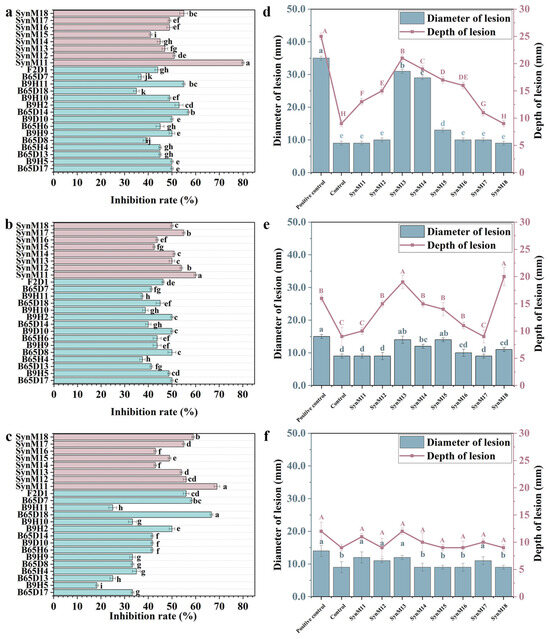 Re-screening of synthetic microbial communities. (a–c) The inhibition rates of synthetic microbial communities and their member strains on Fusarium solani, Fusarium oxysporum, and Fusarium avenaceum on vitro. Red represent synthetic communities, green represent single strains. (d–f) The effects of synthetic microbial communities on the diameter and depth of potato lesions infected with Fusarium solani, Fusarium oxysporum, and Fusarium avenaceum, respectively. The uppercase and lowercase letters in (d–f) represent significant difference markers (significance level is 0.05).