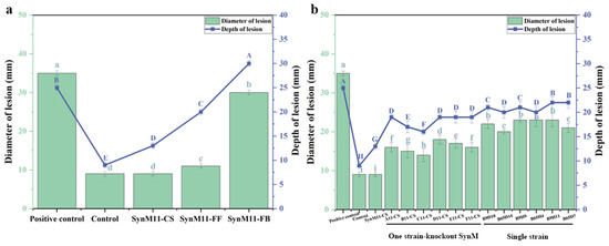 Screening of active components and member strains of synthetic microbial communities. (a) The effects of SynM11 cell suspension (SynM11-CS), fermentation filtrate (SynM11-FF), and fermentation broth (SynM11-FB) on the lesion diameter and depth of Fusarium solani-infected potatoes. (b) Synthetic communities, one strain-knockout synthetic communities, single strain affects the lesion diameter and depth of Fusarium solani-infected potatoes. The uppercase and lowercase letters in subfigures represent significant difference markers (significance level is 0.05).