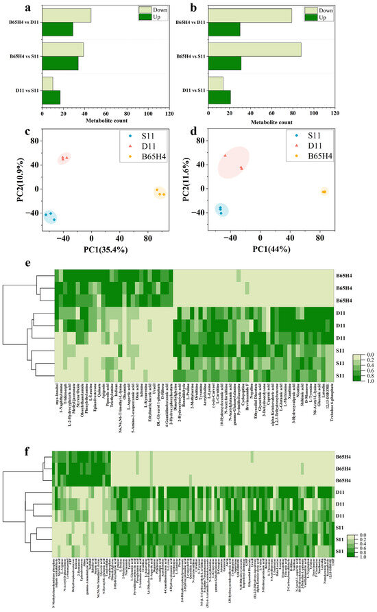 Comparative metabolomics of the synthetic microbial community, one strain-knockout synthetic communities, and the single strain. (a,b) The statistics of the quantity of extracellular (a) and intracellular (b) different metabolites (S11: SynM11, D11: SynM11 knockout B65H4 single strain, B65H4: single strain). (c,d) PLS-DA analysis of extracellular (c) and intracellular (d) different metabolites between S11, D11, and B65H4. (e,f) The heatmaps of extracellular (e) and intracellular (f) different metabolites between S11, D11, and B65H4.