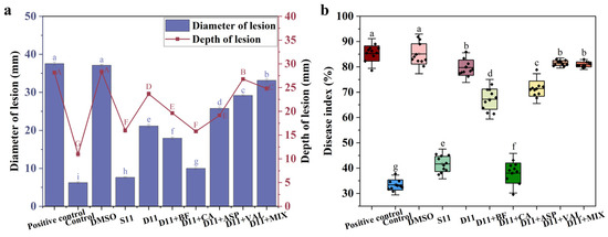 The effects of key metabolites on lesion diameter, lesion depth, and disease index of Fusarium solani-infected potatoes. (a) Lesion diameter and depth. (b) Disease index. (S11: SynM11, D11: SynM11 knockout B65H4 single strain. BF: brevianamide F, CA: caproic acid, ASP: L-aspartic acid, VAL: L-valve, MIX: mixing four key metabolites. DMSO: dimethyl sulfoxide). The uppercase and lowercase letters in subfigures represent significant difference markers (significance level is 0.05).