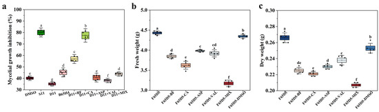 We inoculated a Fusarium solani plug in the middle of PDA culture medium, placed four pieces of drug-sensitive paper around it, and then added 20 μL D11, 4 μL key metabolites on top of it. After 7 days of cultivation at 28 °C, we calculated the mycelial growth inhibition rate according to the formula in Section 3.1. We prepared 50 mL of PDB sterile culture medium, then added 1 mL of key metabolites and 2 mL of Fusarium solani cell suspension at 28 °C for 5 days at 180 r/min. We measured the dry and fresh weight of the mycelium. Specifically, after filtering the mycelium, we used filter paper to absorb the moisture between the mycelium, and weighed it to obtain the fresh weight of the mycelium. After drying at 105 °C to a constant weight, we weighed it to obtain the dry weight of the mycelium [8].