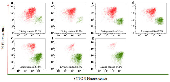Flow cytometry analysis of the effects of key metabolites on the conidia viability of Fusarium solani. (a) Positive controls. (b) Fusarium solani treated with caproic acid. (c) Fusarium solani treated with brevianamide F. (d) Fusarium solani treated with mixed metabolite. (e) Fusarium solani treated with L-ASP. (f) Fusarium solani treated with L-VAL. (g) Negative control.