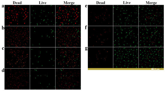 Fluorescence microscopy images of the effects of key metabolites on the growth of Fusarium solani conidia. (a) Positive controls. (b) Fusarium solani treated with caproic acid. (c) Fusarium solani treated with brevianamide F. (d) Fusarium solani treated with mixed metabolite. (e) Fusarium solani treated with L-ASP. (f) Fusarium solani treated with L-VAL. (g) Negative control. Red represents dead conidia, green represents live conidia.