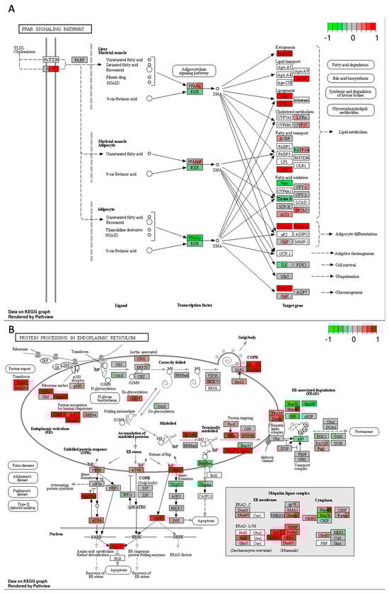 Figure 11C. This upregulation likely triggered the accumulation of misfolded proteins, ER stress, and unfolded protein response. Notably, there was strong upregulation of proteins involved in dealing with misfolded protein responses, indicating ER stress. However, the expression of genes targeting misfolded proteins for proteasomal degradation was decreased, suggesting further accumulation of misfolded proteins in the ER. Moreover, increased expressions of