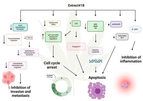 Another mechanism by which extract #18 combats cancer is by potentially inhibiting cancer cell invasion and metastasis. Expression analysis revealed decreased the transcription of genes involved in adherent junction formation, dysregulation of the actin cytoskeleton, and downregulation of Rho signalling, which regulates cytoskeletal dynamics, cell migration, and cell cycle progression. The reduced expression of cell adhesion molecules implicated in transendothelial migration suggests the inhibition of cell invasion. Additionally, decreased expression of TGF-β gene could impede the EMT, a crucial mechanism in tumour invasiveness. Notably, diminished extracellular vesicle formation, essential for preparing metastatic niches, was also observed. Furthermore, cannabis extract #18 downregulated COX-2 expression, potentially exerting an anti-inflammatory effect on the CRC cell line.