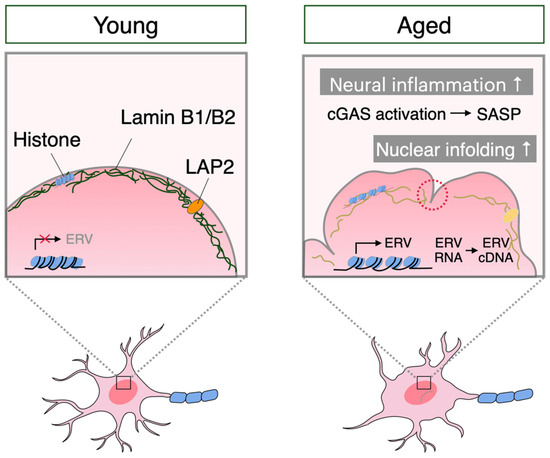 Abnormalities in the nuclear structure are also common in neuronal senescence (Figure 1). It has been reported that aged primate frontal lobe neurons also show decreased transcript levels of LMNB1 and LMNB2, the constituent factor of the nuclear lamina, and LAP2β, a heterochromatin-related inner membrane of the nuclear envelope [25]. Along with this reduction in subnuclear heterochromatin, the integrity of the nuclear lamina was also found to be impaired. This neuron-specific change in nuclear architecture leads to the activation of endogenous retrovirus (ERV) retrotransposons, which in turn triggers the activation of the cGAS-mediated innate immune response downstream, inducing an increase in proinflammatory cytokines. In addition, knockdown of Lamin B1 and Lamin B2 using siRNA in human embryonic stem cell (hESC)-derived neurons resulted in the loss of heterochromatin and activation of the cGAS pathway via ERV retrotransposons, as well as increased Aβ accumulation and gene expression involved in senescence and inflammation [25]. This also suggests that the starting point of the neuronal senescence cascade is the loss of LaminB1 and Lamin B2. Neurons also undergo complex changes in nuclear morphology following external environmental stimuli, which play an important role in the regulation of gene expression. It has been shown that cell morphology influences the shape and size of the nucleus, which may affect cell function. Recent studies have reported that the size and shape of neuronal nuclei, which change with age and disease, also vary from region to region of the brain [26]. Twenty-four-month-old aging mice show that the size of neuronal nuclei in the neocortex and striatum decreases compared to those in young mice. In addition, the roundness of nuclei in striatal neurons significantly decreased, and the size of nuclei in hippocampal CA3 pyramidal neurons increased with age. Furthermore, neural activity induced by exposure to a novel environment caused a reduction in the size of nuclei and an increase in the number of nuclei with infolding. These results also indicate that neuronal activity induced by external stimuli alters nuclear morphology, which may be crucial for regulating gene expression and chromatin structure. It has also been reported that this nuclear infolding is a reversible process [27]. In the nuclei of young neurons, morphological changes of the nuclear periphery were observed within 10 min after stimulation, and the nuclei returned to a spherical shape when the stimulus was removed, whereas in the nuclei of aged neurons, the dynamic behavior of the nuclei was reduced. Atomic force microscopy analysis revealed that nuclei stiffen in aging neurons, suggesting that nuclear stiffness is related to the loss of dynamics of nuclear shape with aging.