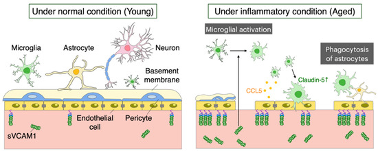 The full mechanism by which the NVU is involved in the destruction and repair of the BBB during aging remains unclear. During inflammation, microglia contribute to both the protection against and loss of BBB integrity. Upon the onset of inflammation, microglia first respond to the released CCL5 from endothelial cells, accumulating around cerebral blood vessels before any changes in BBB permeability occur (Figure 2). This process gives rise to the expression of Claudin-5 in microglia, infiltrating through the neurovascular unit, and forming tight junctions in contact with endothelial cells. On the other hand, if this inflammatory state persists, microglia change to a phagocytic state and eliminate fragments of astrocyte foot processes, causing leakage through the BBB and reducing BBB integrity. The actions of microglia that control BBB integrity are opposing over time and through signaling pathways, suggesting a dual role in the maintenance of BBB integrity [41]. Because brain aging induces inflammation, understanding the mechanism linking microglia and vascular endothelial cells during inflammation may also provide insights into comprehending the process of brain aging. In addition, RNA sequencing of microglia and astrocytes before and after changes in BBB permeability in normally aged mice at 12 months of age revealed that microglia show significant changes in protein phosphorylation and negative regulation of phagocytic vesicles, whereas astrocytes show no significant changes in the restoration of BBB function due to enzymes and peptidase inhibitory activity [64].