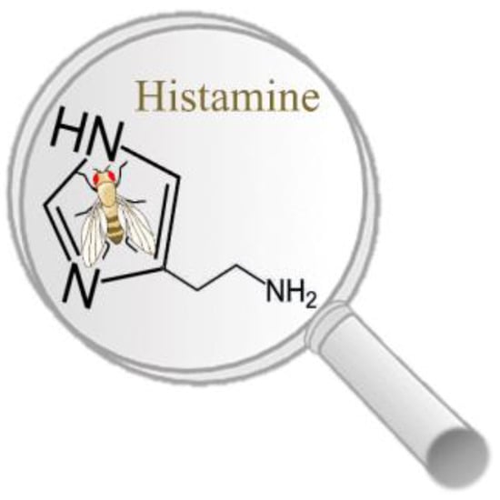 Drosophila melanogaster, or the fruit fly, has been widely used for more than a century in biological research, and its use in genetics, physiology, pathology, and evolution goes back to C.W. Woodworth, the very first to breed the fruit fly in captivity and to propose Drosophila as a model organism for scientific exploitation. Seminal discoveries were made with the aid of this invertebrate, such as the chromosomal theory of inheritance [] that, back in 1933, gained Nobel prize recognition for T.H. Morgan. Five additional Nobel prizes have been awarded since then for groundbreaking discoveries made using fruit flies, such as the demonstration that X-ray irradiation increases mutation rates, the genetic control of embryonal development, the odor receptors and organization of the olfactory system, the activation of innate immunity, and the molecular mechanisms of circadian rhythms. Today, more than 120,000 or 30,000 publications are listed in PubMed searches with the basic queries “Drosophila” or “Drosophila model”, respectively. This emphasizes the high impact of this organism, not just as a genetic box to disentangle basic mechanisms and pathways, but also, above all, as a versatile experimental organism to model normal and/or pathological conditions. The limitations and uncertainties are few indeed, but there are several advantages of exploiting the fruit fly in biomedical research. This is the main reason why Drosophila has attracted massive scientific interest and poses several challenges in the histaminergic field (Figure 1).