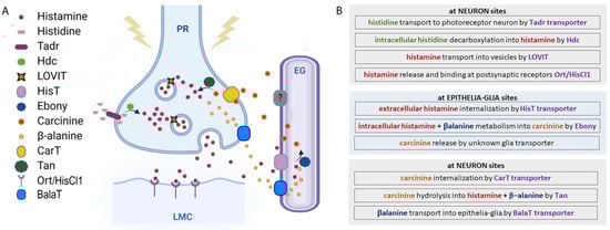 Histamine metabolic pathway. (A) Histamine metabolism. At the presynaptic terminal of the photoreceptor neuron (PR), histamine is synthesized by the Hdc enzyme from L-histidine, which is transported by Tadr. Histamine is transported into vesicles by LOVIT. After a stimulus, vesicles release histamine that binds Ort/HisCl1 receptors exposed by the large monopolar postsynaptic cells (LMCs). Histamine reuptake is mediated by a HisT transporter placed on epithelial glia (EG), where histamine is coupled with β-alanine and transformed into carcinine by Ebony. Carcinine exits the EG and returns to PR through the CarT transporter and is then hydrolyzed into histamine and β-alanine by Tan hydrolase. β-alanine is released by neurons and internalized by glia through the BalaT transporters. (B) Schematic view of histamine metabolism in Drosophila.