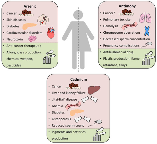 The effect of arsenic, antimony, and cadmium on human health and life. Light red indicates the negative effects and diseases caused by poisoning with particular metals/metalloids on human health. Light green indicates the positive use of metals/metalloids in industry and drug therapies.