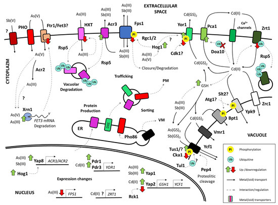 The compounds of highly toxic elements such as cadmium, arsenic, and antimony share some common mechanisms of cellular toxicity. For instance, they can interact with various cellular macromolecules, such as DNA, proteins, and membranes. As a result, they induce serious cellular disturbances, including DNA damage [10,11,12], oxidative stress [13,14,15], and proteotoxicity [16,17]. To cope with these challenges, in the course of evolution, cells have developed distinct mechanisms of detoxification and adaptation involving the regulation of specific transporters and enzymes involved in the uptake, sequestration, metabolism, or export of these toxic compounds. Cells need to adjust the membrane protein composition, as they function as a contact site between the extracellular and intracellular environment (plasma membrane, PM), a synthesis hub for newly produced membrane proteins (endoplasmic reticulum, ER), or a sequestration site of toxic compounds (vacuolar membrane, VM) (Figure 2). The production, activity, and stability of membrane proteins are tightly regulated at multiple levels, including transcription (through the induction of specific activators and repressors as well as translational machinery), but also at the protein level by various post-translational modifications (e.g., phosphorylation and ubiquitylation) (Figure 2). These modifications can affect the localization, conformation, interaction, and degradation rate of membrane proteins, thus modulating their function and efficiency in the process of uptake, metabolism, and efflux of toxic compounds.