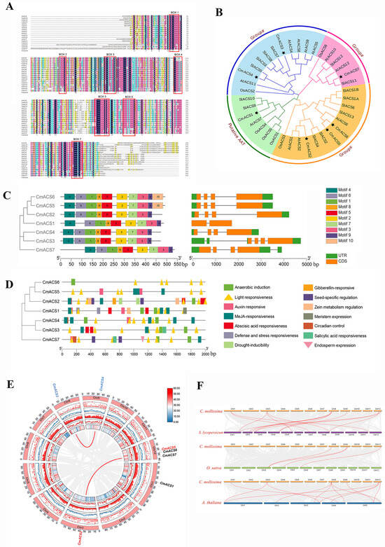 Bioinformatics analysis of the ACS gene family in the chestnut. (A) Multiple sequence alignment of the chestnut ACS protein sequences. Boxes 1–7 represent seven conserved structural domains of the ACS gene family. (B) Phylogenetic relationships of seven ACSs in chestnut and other plants. A star (★) represents chestnut ACS genes. (C) Phylogenetic relationships, gene structure, and architecture of conserved protein motifs. Boxes of different colors show different motif. (D) Cis-element analysis of the promoters of CmACSs. Cis-elements with similar functions are shown in the same color. Boxes of different colors show different cis-elements. (E) Chromosomal distribution of CmACS genes. From the outside to the inside, the first circle represents the chromosome coordinates; the second to fifth circles represent the GC content and density of the positive and negative chains, respectively; the sixth circle represents the gene density distribution; and the red lines connect gene pairs. (F) Synteny analysis of ACS genes in C. mollissima, S. lycopersicum, O. sativa, and A. thaliana. The chestnut genome, protein sequences, and annotation files were searched and downloaded through the GigaDB website (http://gigadb.org/dataset/view/id/100643, accessed on 16 October 2022) [26].