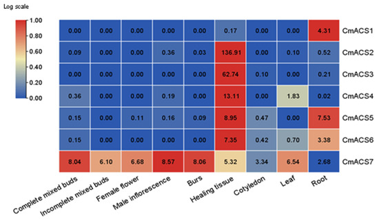Expression patterns of CmACS genes in different tissues. The numbers in the boxes are the relative expressions of the genes.