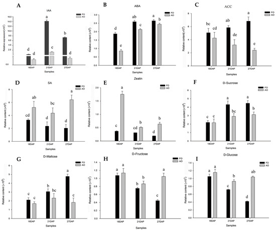 Analysis of CmACS gene expression and ACC content at different developmental stages. (A) Changes in the expression of CmACS genes at different developmental stages in ovules. DAP represents days after pollination, and ovules at 21 DAP and 27 DAP represent fertile ovules after pollination. (B–H) Relative expression of CmACS1-7 in fertile and abortive ovules. (I) Relative content of ACC in developing and abortive ovules. FO represents a fertile ovule, and AO represents an abortive ovule. Unlabeled lowercase letters in figure are non-significant differences.