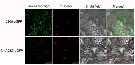 Subcellular localization of CmACS7. The recombinant plasmid (CmAcs7-eGFP) and control plasmid (2300-eGFP) were transiently expressed in tobacco cells. mCherry is a red fluorescent protein variant for nuclear localization that appears in red under fluorescence. eGFP is an enhanced green fluorescent protein that appears in green under fluorescence. The red fluorescence represents the location of the nucleus and the green fluorescence represents the location of the carrier. The scale bars represent 50 μm and 75 μm or the control plasmid and recombinant plasmid, respectively.