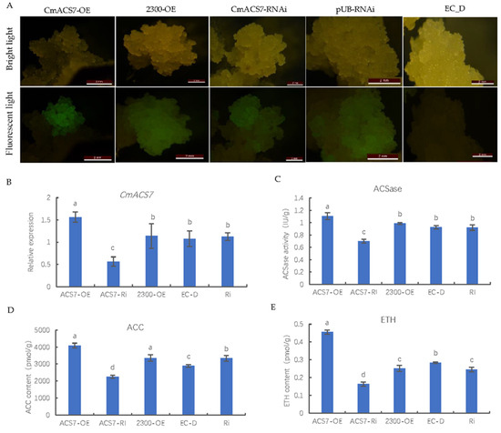 To investigate whether CmACS7 has ACSase activity in the chestnut, chestnut healing tissues containing the overexpression vector CmACS7-OE and the double-stranded RNA interference vector CmACS7-RNAi were constructed. Fluorescence emission was observed under a fluorescence microscope after 14 days of coculture, and the results are shown in Figure 5A. The fluorescence-carrying healing tissues were selected under a fluorescence microscope and then subjected to screening in a medium containing kanamycin (100 mg·L−1) until positive healing tissue was obtained. The qRT–PCR data showed that the CmACS7-OE vector yielded the highest expression in healing tissues, CmACS7-Ri resulted in the lowest expression, and the three controls showed intermediate levels of expression and were not significantly different from each other (Figure 5B). We performed a qRT–PCR analysis of all CmACS genes in the genetically transformed positive and WT (EC_D) chestnut healing tissues. The data revealed no significant differences in the expressions of any of the CmACS genes except for the CmACS7 gene. The findings thus demonstrated that the genes’ expression was not disturbed and that RNA interference was specific (Figure S1). The ACSase activity and ACC and ETH contents in healing tissue containing the overexpression vector CmACS7-OE and interference vector CmACS7-RNAi were determined, and the results are shown in Figure 5C–E. The ACSase activity and ACC and ETH contents were greater in the CmACS7-overexpressing healing tissues than in the other healing tissues, whereas the ACC and ETH contents were lower in the ACS7-RNAi healing tissues than in the other healing tissues. These findings indicate that CmACS7 has ACS synthase activity and that the overexpression of CmACS7 promotes ETH synthesis.