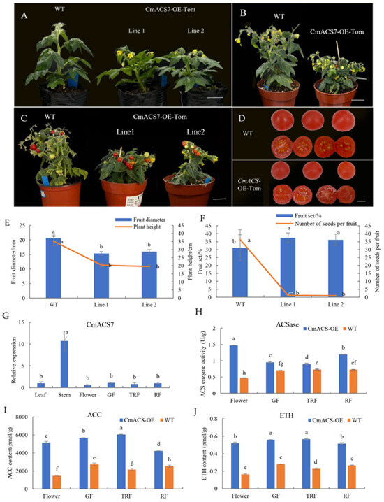 Phenotypic traits of transgenic S. lycoperisicum plants overexpressing CmACS7. (A) Flower initiation. (B) Bloom stage. (C) Fruiting stage. (D) External phenotypes and seed production of ripe S. lycoperisicumes. (E) Fruit diameter and plant height of CmACS7-overexpressing and WT S. lycoperisicum plants. (F) Fruit set and number of seeds per fruit of CmACS7-overexpressing and WT S. lycoperisicum plants. (G) Expression of the CmACS7 gene in different tissues of transgenic S. lycoperisicum plants. (H) ACSase activity. (I) ACC content. (J) ETH content. Unlabeled lowercase letters in figure are non-significant differences.