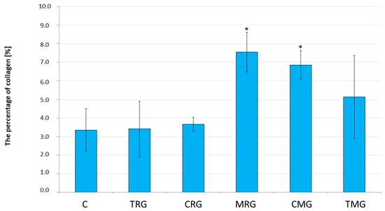 In the rat hearts, the percentages of collagen obtained (n = 6 in each group except CRG group, in which n = 4) were significantly higher in the MRG (p = 0.009) and CMG (p = 0.039) groups than in the control group. In the TRG, CRG, and TMG groups, the above parameters were not statistically significant compared to the control group (Figure 1).