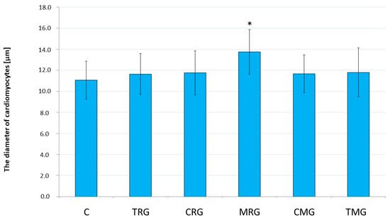 Comparison of cardiomyocyte diameters in the hearts of rats between control and experimental groups. Results are expressed as the mean and standard deviation. * p < 0.05 vs. control. C—control group without medication, (n = 6); TRG—rats treated with rapamycin, tacrolimus, and glucocorticosteroids, (n = 6); CRG—rats treated with rapamycin, cyclosporin A, and glucocorticosteroids, (n= 4); MRG—rats treated with rapamycin, mycophenolate mofetil, and glucocorticosteroids, (n = 6); CMG—rats treated with cyclosporin A, mycophenolate mofetil, and glucocorticosteroids, (n = 6); TMG—rats treated with tacrolimus, mycophenolate mofetil, and glucocorticosteroids, (n = 6).